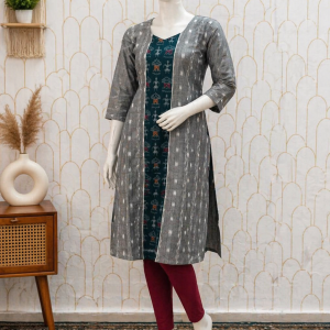 Sambalpuri Ikat Kurti – Grey & Teal Panel Design