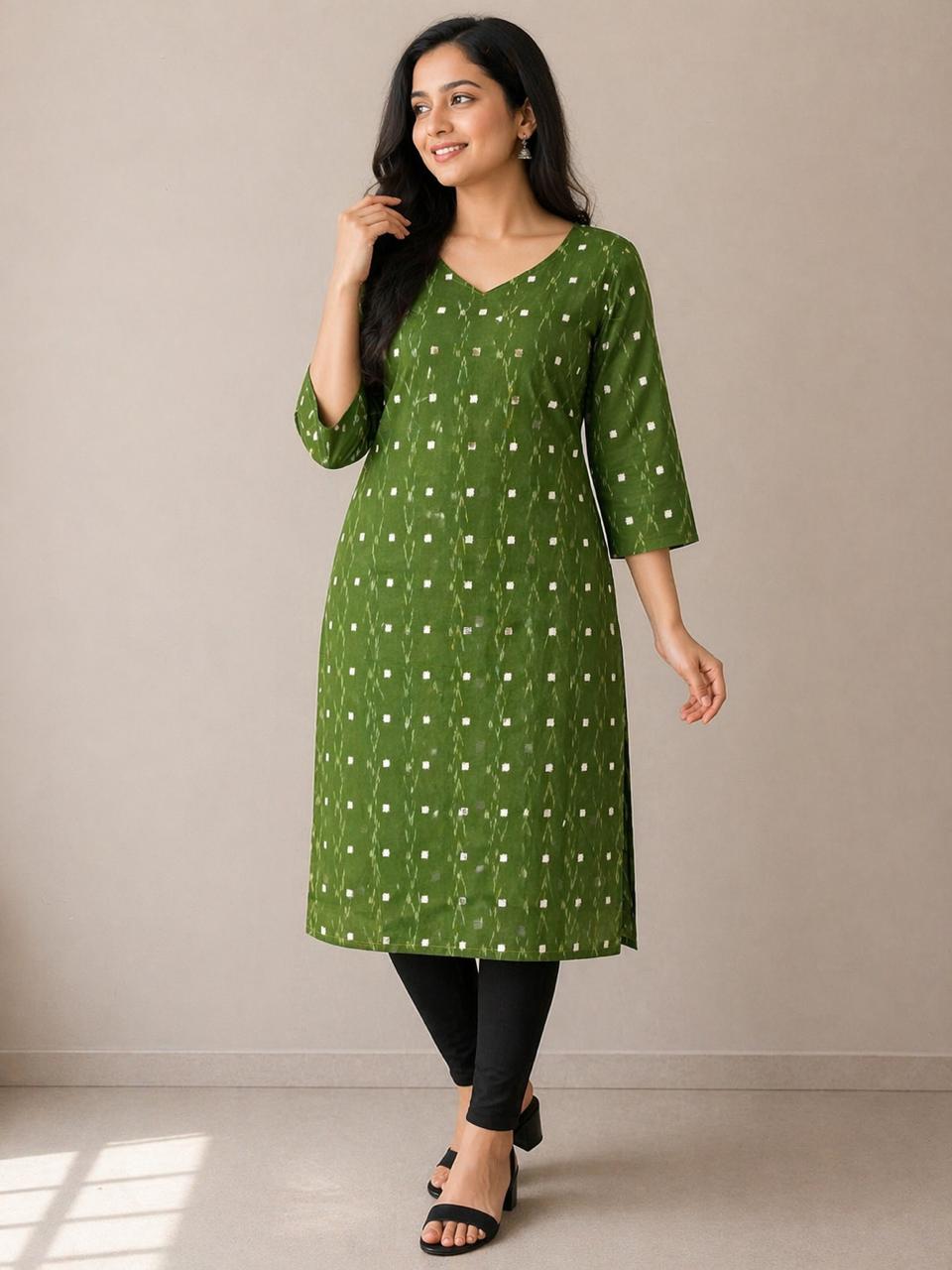 Fresh green Saptapar Sambalpuri printed kurti crafted from soft cotton fabric. Perfect for daily wear, office styling, and comfortable ethnic fashion.