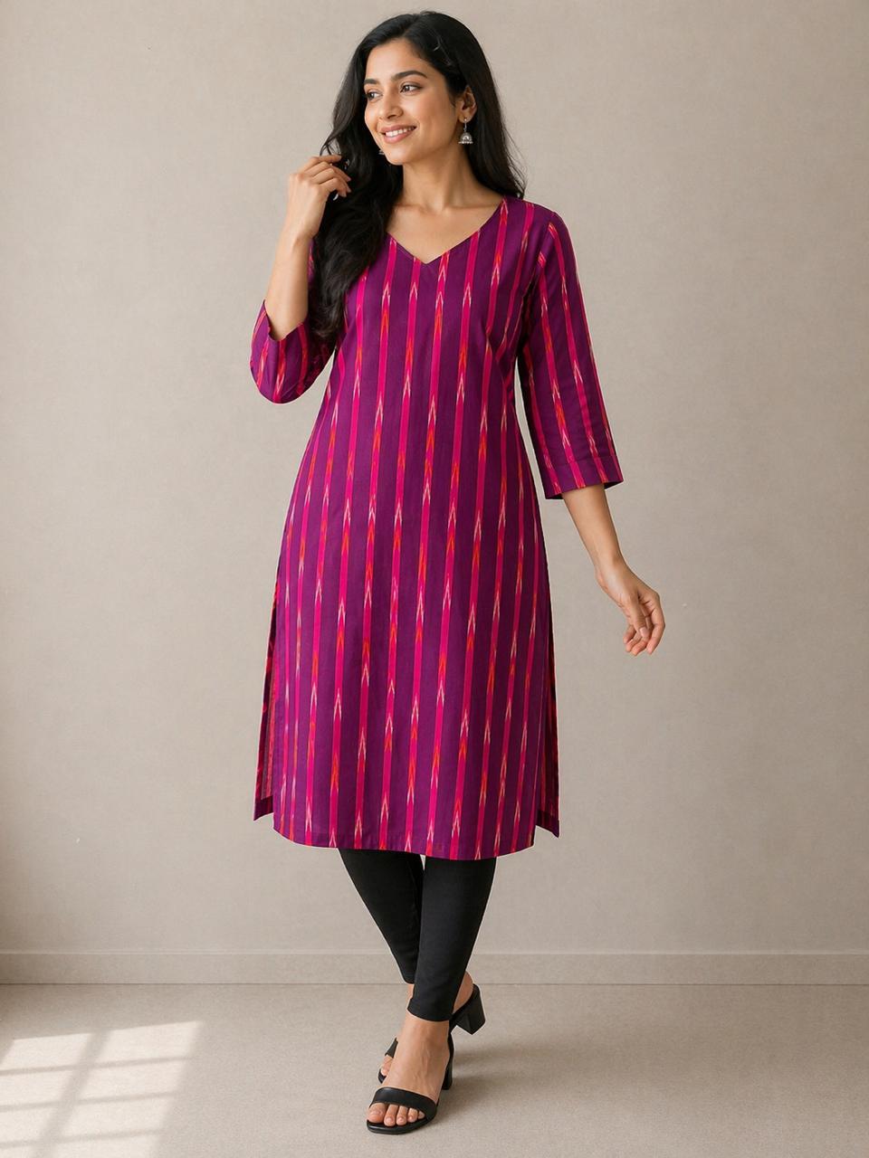 Add a bold and vibrant touch to your wardrobe with this Magenta Saptapar Sambalpuri Printed Kurti, inspired by Odisha’s traditional handloom artistry. Featuring a striking Saptapar vertical pattern, this kurti offers a modern yet ethnic appeal.
