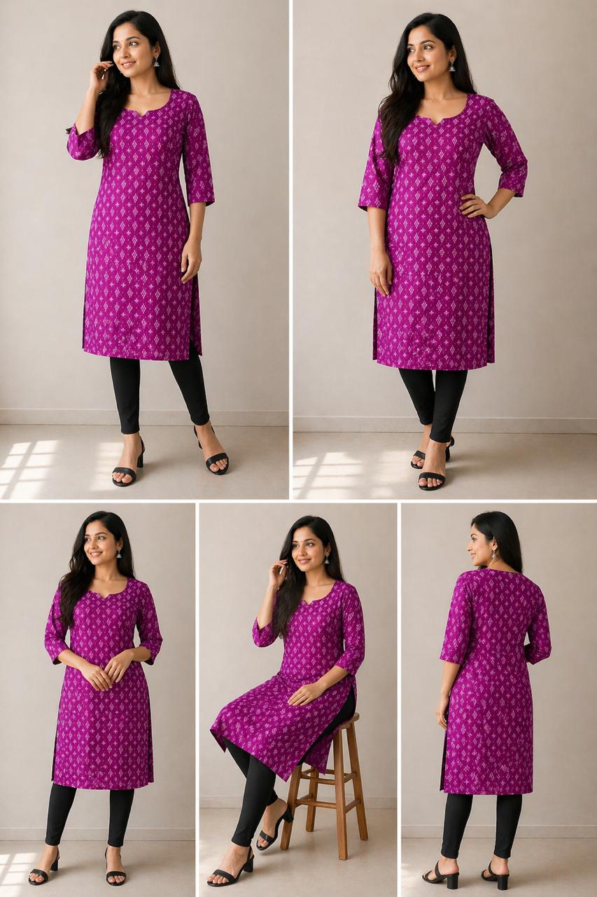 Made from breathable cotton fabric, this kurti ensures all-day comfort while maintaining a stylish appearance. The rich purple shade enhances its premium feel, making it perfect for office wear, casual outings, and everyday ethnic styling.